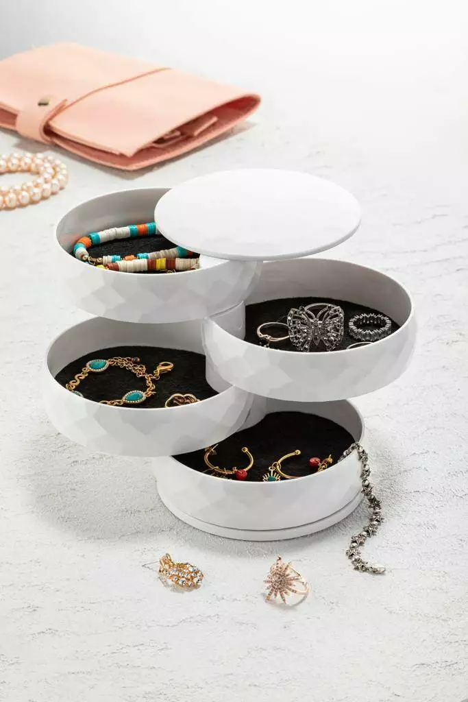 Органайзер для прикрас 4-рівневий Dunya Plastik білий, пластик 07414 - це стильний та функціональний аксесуар, який допоможе вам зберегти ваші прикраси в порядку та безпеці. особливості: - Кругла форма органайзера дозволяє йому займати мінімум місця на туалетному столику чи комоді. - 4 рівні органайзера забезпечують достатньо місця для зберігання всіх ваших прикрас, включаючи сережки, каблучки, браслети, ланцюжки та інші аксесуари. - Прозорі перегородки органайзера дозволяють легко побачити, де знаходиться кожна прикраса. - Пластиковий матеріал органайзера стійкий до пошкоджень та легко миється. розміри: - Діаметр: 11 см. - Висота: 11,8 см. Колір органайзера Білий.