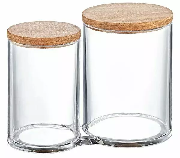 Практичний набір з двох циліндричних банок Boxup FT-215. Виготовлені з прозорого пластику з дерев'яними кришками, ідеально підходять для зберігання ватних дисків, паличок, косметичних спонжів або інших дрібних аксесуарів, допомагаючи підтримувати порядок.