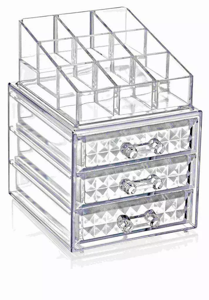 Переваги: - 12 відділень для зберігання дозволять вам розмістити всі ваші косметичні засоби, включаючи тіні, помади, лаки для нігтів, пензлі та багато іншого. - Три висувні полиці забезпечують зручний доступ до косметики, розташованої у глибині органайзера. - Міцний пластик органайзера стійкий до пошкоджень та легко миється. - Невеликі розміри органайзера 12×15×17 см дозволяють розмістити його навіть у невеликому просторі.
