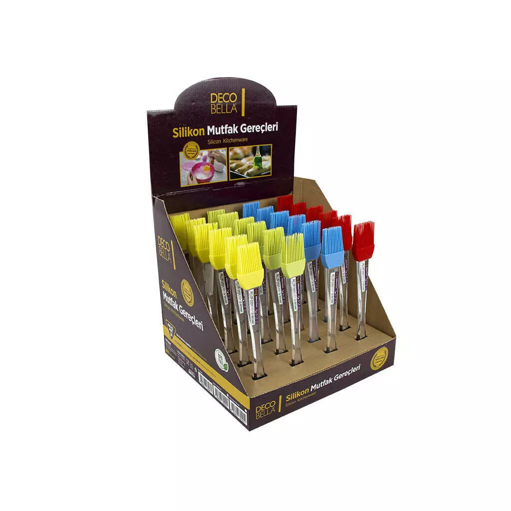 Кулінарний пензлик Omak Plastik DecoBella 82102 - це зручний інструмент для нанесення олій, соусів та глазурів при приготуванні їжі. Особливості: 1. Розмір: пензлик має компактні розміри 0,7x3,8x22,3 см, що робить його легким в керуванні та зручним для зберігання в кухонній ящику. 2. Матеріал: виготовлена з силікону та пластику, що забезпечує міцність та гнучкість. Силіконові щетинки дозволяють легко та рівномірно розподіляти рідкі інгредієнти.