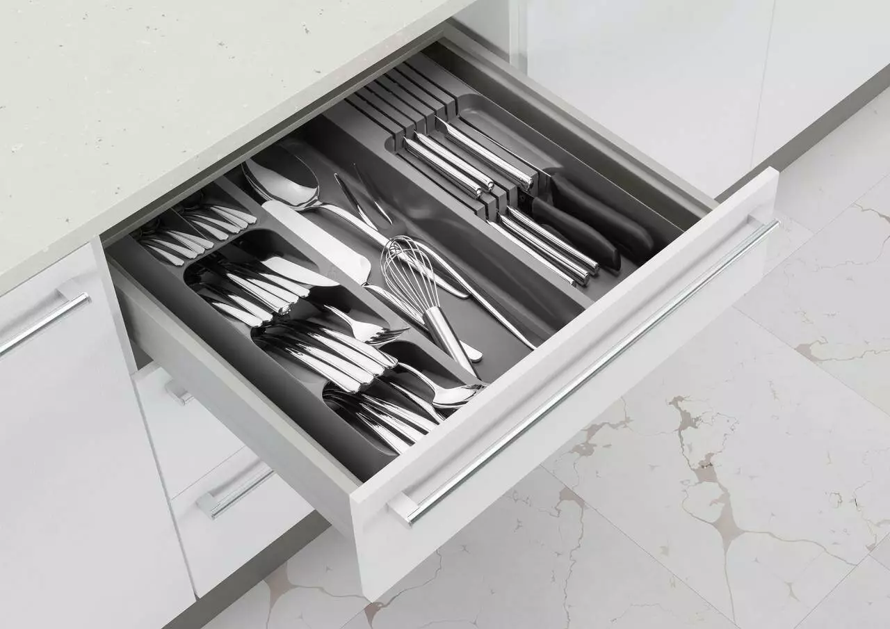 Потрійний лоток для столових приборів 38x39x5,5 см, сірий Emhouse EP-902 - це функціональне та стильне рішення для зберігання столових приборів на будь-якій кухні. Особливості: - Розмір: 38x39x5, 5 см. - матеріал: пластик. - Колір сірий.